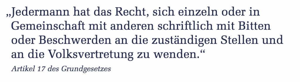 Bürgerpetitionen sind nicht nur ein Instrument der politischen Teilhabe, sondern auch ein fundamentales Recht, das tief in den demokratischen Werten des Grundgesetzes verankert ist. Artikel 17 des Grundgesetzes (GG) garantiert jedem Bürger das Recht, sich einzeln oder gemeinsam mit anderen schriftlich an die zuständigen Stellen und die Volksvertretung zu wenden. Dieser Artikel, der das Petitionsrecht regelt, ist ein Ausdruck der Verfassungstreue und Teil eines demokratischen Systems, das auf Beteiligung, Transparenz und Verantwortung beruht.