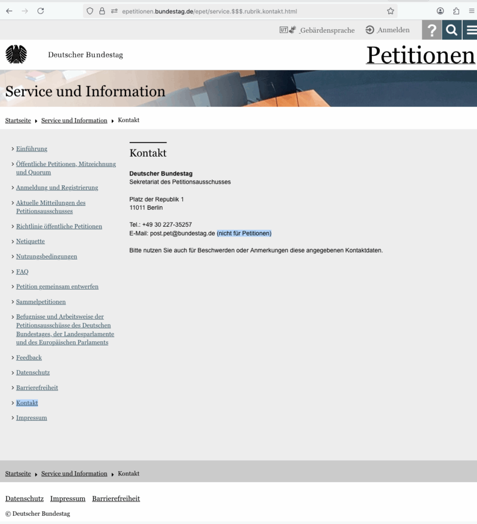 Auf der offiziellen Informationsseite des Petitionsausschusses werden verschiedene Kontaktmöglichkeiten aufgeführt. Neben der dort angegebenen E-Mail-Adresse steht jedoch der Hinweis ‚nicht für Petitionen‘. Vermutlich soll damit verdeutlicht werden, dass diese Adresse ausschließlich für allgemeine Anfragen gedacht ist – nicht für die formelle Einreichung von Petitionen